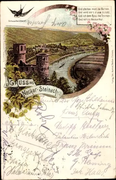 Litho Neckarsteinach in Hessen, Blick auf den Ort, Schwalbennest