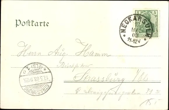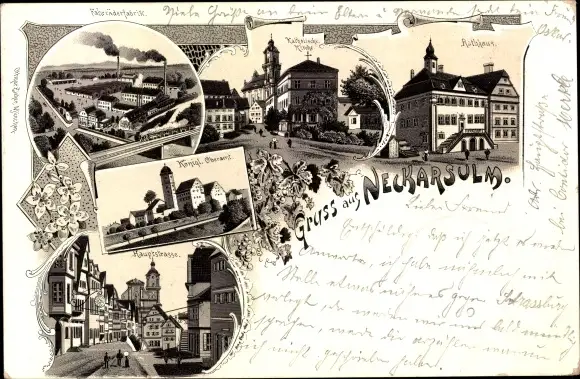 Litho Neckarsulm in Baden Württemberg, Rathaus, Kath. Kirche, Hauptstraße