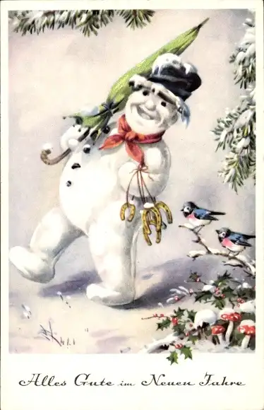 Litho Neujahr, Schneemann, Hufeisen