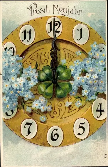 Litho Neujahr, Uhr, Mitternacht, Kleeblatt