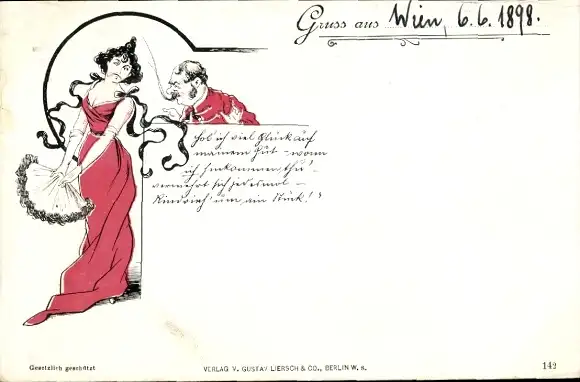 Litho Noble Frau in rotem Kleid, Fächer, Mann in Uniform