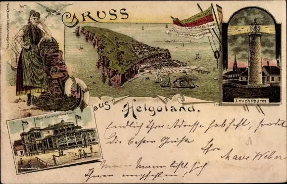 Litho Nordseeinsel Helgoland, Leuchtturm, Totalansicht, Konversationshaus