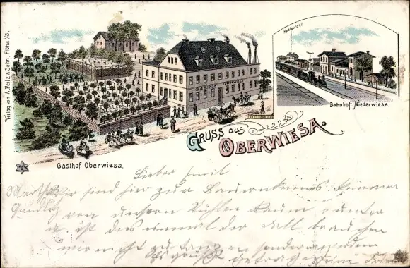 Litho Oberwiesa Niederwiesa Sachsen, Bahnhof, Gleisseite, Gasthof