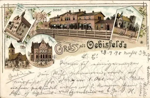 Litho Oebisfelde in Sachsen Anhalt, Bahnhof, Gleisseite, Postamt, Kirche, Burg