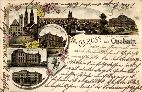 Litho Oschatz in Sachsen, Panorama, Kirche, Markt, Realschule, Seminar