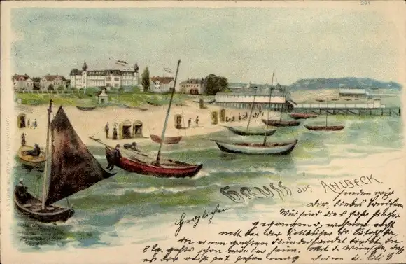 Litho Ostseebad Ahlbeck auf Usedom, Strandpartie, Boote