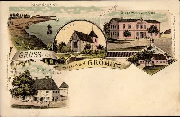 Litho Ostseebad Grömitz in Holstein, Gasthof zur Post, Kirche, Gasthof zur Linde