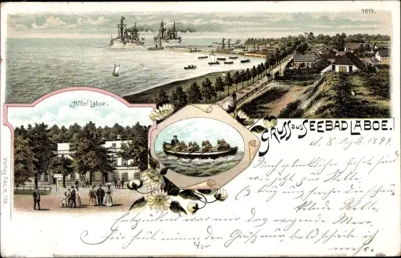 Litho Ostseebad Laboe, Hotel Laboe, Kriegsschiffe, Ruderboot