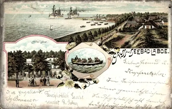 Litho Ostseebad Laboe, Hotel Laboe, Kriegsschiffe, Ruderboot
