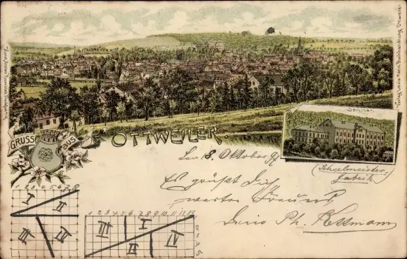 Litho Ottweiler im Saarland, Seminar, Totalansicht der Ortschaft