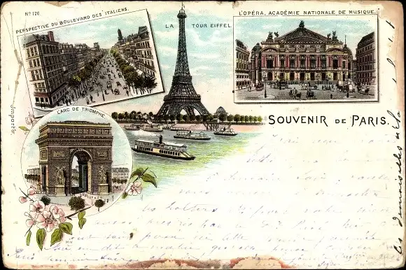 Litho Paris, Seine, Boulevard des Italiens,, Arc de Triomphe, Opéra, Eiffelturm