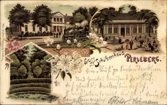 Litho Perleberg in der Prignitz, Schützenhaus, Dampflok, Gartenpartie