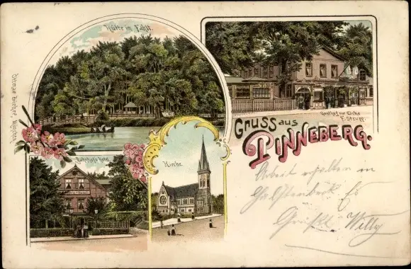 Litho Pinneberg in Schleswig Holstein, Hütte im Fahlt, Kirche, Bahnhofshotel, Gasthof zur Eiche