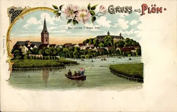 Litho Plön in Schleswig Holstein, Der kleine Plöner See, Ruderboot, Kirche