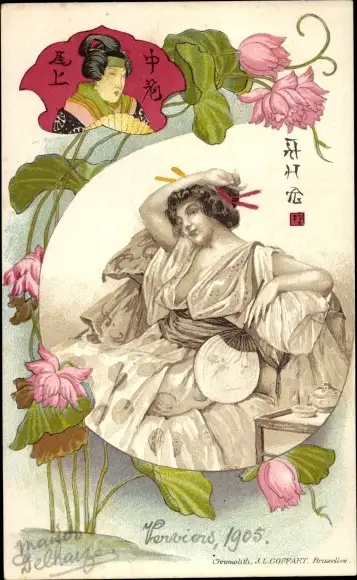 Litho Portrait einer jungen Frau in asiatischer Tracht, Fächer, Blumen