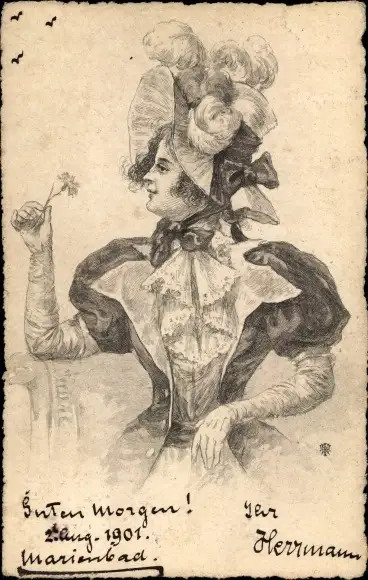 Litho Portrait einer noblen Frau, Hut, Blumen