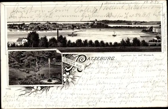 Litho Ratzeburg in Schleswig Holstein, Totalansicht vom Ort, Fontäne