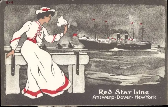Litho Red Star Line, Antwerp, Dover, New York, Passagierdampfer, winkende Frau