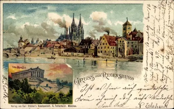 Litho Regensburg an der Donau Oberpfalz, Stadtpanorama, Walhalla