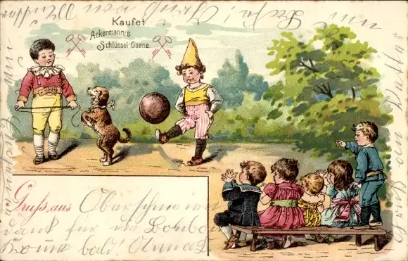 Litho Reklame, Ackermann's Schlüssel-Garne, Hundedressur