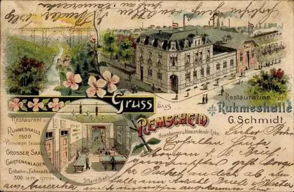 Litho Remscheid im Bergischen Land, Restauration Ruhmeshalle, G. Schmidt, Billardsaal, Riesenbrücke
