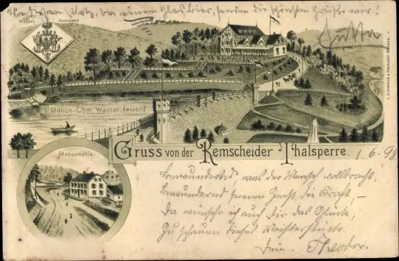 Litho Remscheid im Bergischen Land, Talsperre, Mebusmühle, Stadtwappen