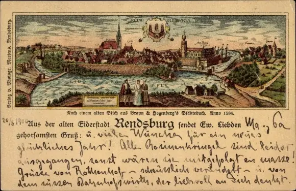 Litho Rendsburg in Schleswig Holstein, Stadt im Jahre 1584