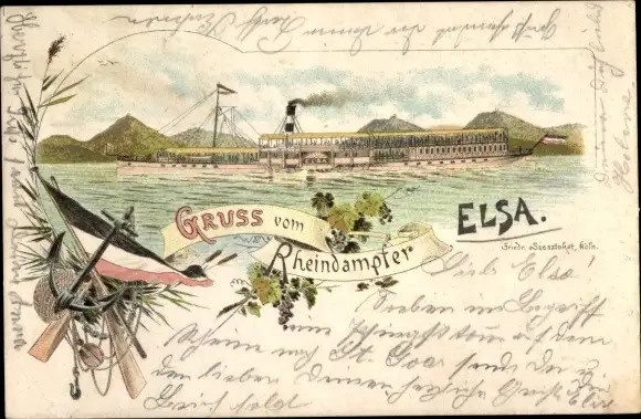 Litho Rheindampfer Elsa, Weinreben, Fahne