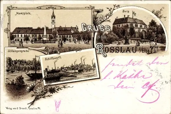 Litho Roßlau an der Elbe Anhalt, Schiffswerft, Schlangengrube, Marktplatz, Burg