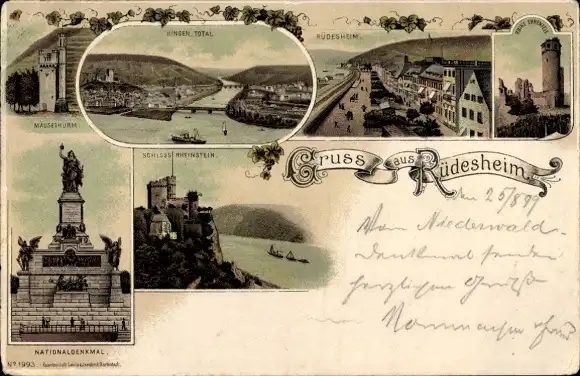 Litho Rüdesheim am Rhein, Schloss Rheinstein, National Denkmal, Mäuseturm, Ruine Ehrenfels