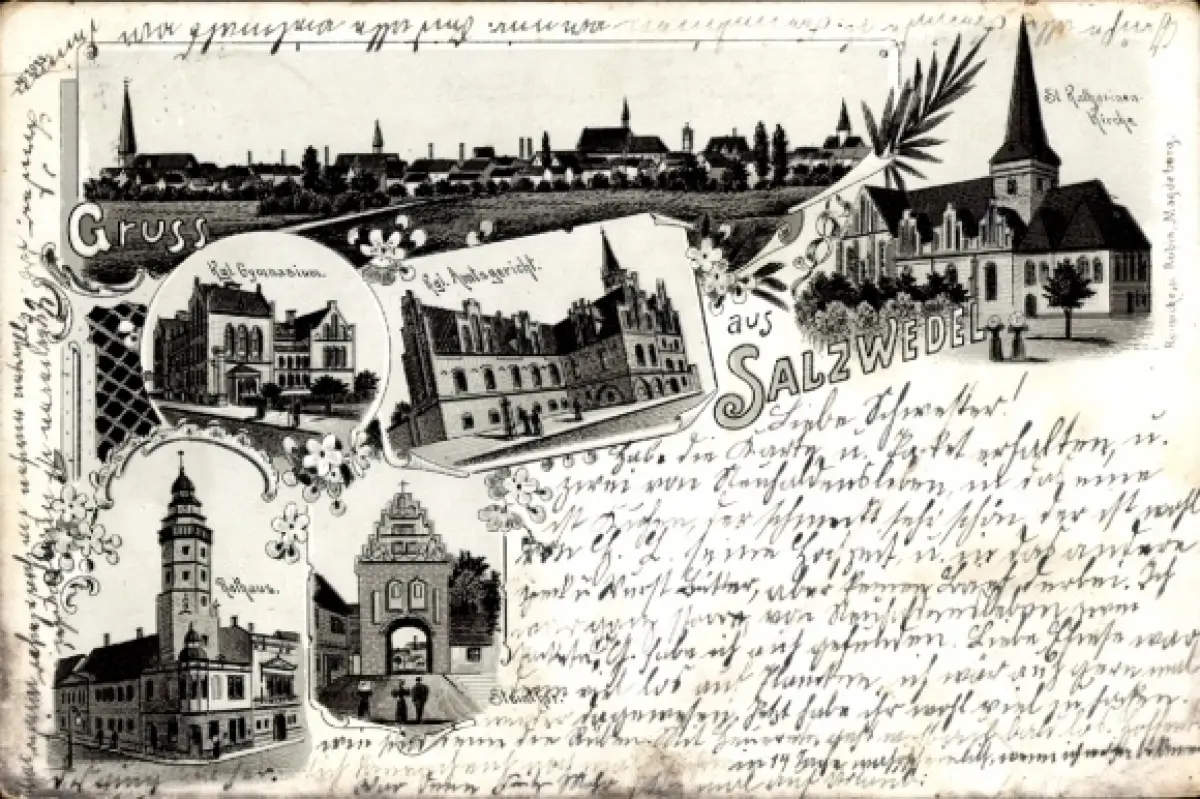 Litho Salzwedel in der Altmark, Amtsgerich, Katharinenkirche, Gymnasium, Rathaus, Steintor