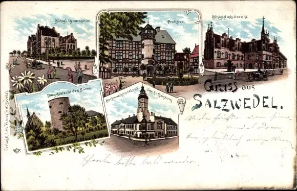 Litho Salzwedel in der Altmark, Gymnasium, Probstei, Amtsgericht, Burg Albrecht, Hotel