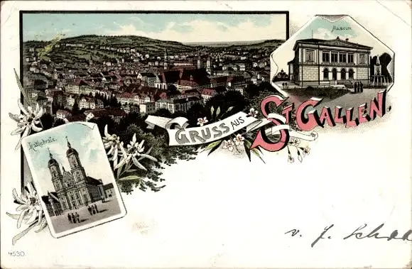 Litho Sankt Gallen Stadt Schweiz, Museum, Kathedrale, Totalansicht
