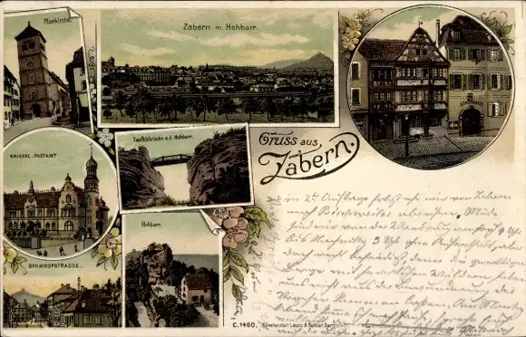 Litho Saverne Zabern Elsass Bas Rhin, Totale mit Hohbarr, Postamt, Teufelsbrücke, Pfarrkirche
