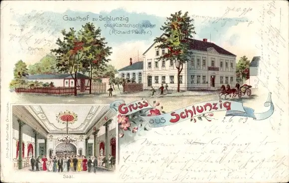 Litho Schlunzig Zwickau in Sachsen, Gasthof zu Schlunzig, Klatschschänke, Saal