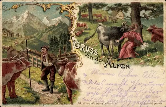 Litho Schweiz, Gruß von den Alpen, Wanderer, Kühe, Frau