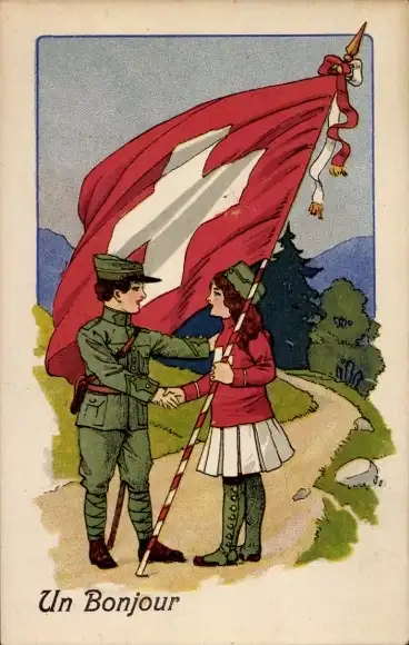 Litho Schweiz, Soldat, Mädchen mit Fahne