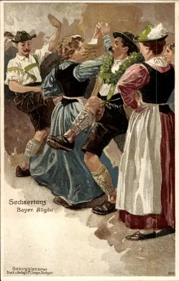 Litho Sechsertanz, Bayerisches Allgäu, Trachten, Gebirgsleben