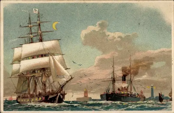Litho Segelschiff, Dampfer, Segelboot, Leuchtturm