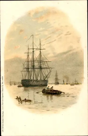 Litho Segelschiff im Hafen, Ruderboot, Hafenszene