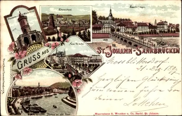 Litho St. Johann Saarbrücken im Saarland, Winterbergdenkmal, Neue Brücke, Ehrenthal