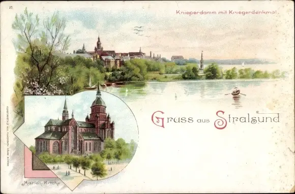 Litho Stralsund in Vorpommern, Knieperdamm, Kriegerdenkmal, Marienkirche
