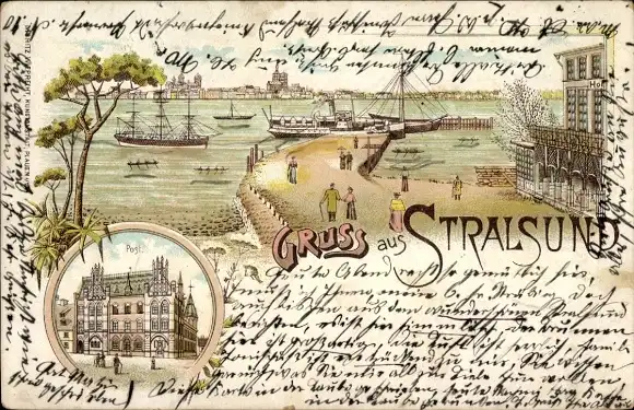 Litho Stralsund in Vorpommern, Panorama, Dampfer, Segelschiff, Post