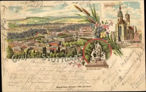 Litho Stuttgart in Baden Württemberg, Stiftskirche, Totalansicht, Hasenberg