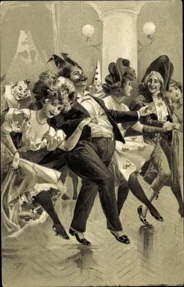 Litho Tanzende Personen in Faschingskostümen