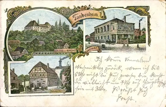 Litho Taubenheim Klipphausen in Sachsen, Schloss, Kirche, Gasthof, Brauerei
