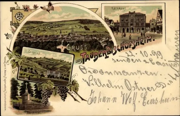 Litho Tauberbischofsheim in Baden, Rathaus, Konvikt, Denkmal, Totalansicht