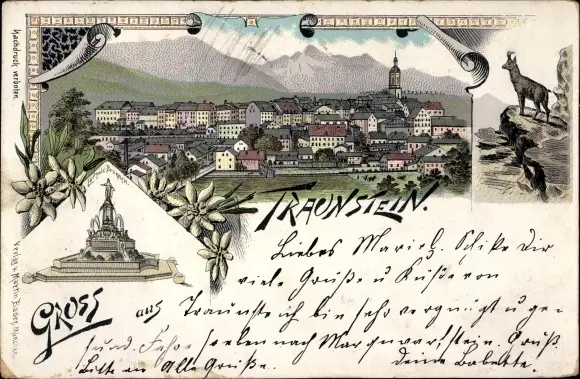 Litho Traunstein in Oberbayern, Totalansicht, Brunnen, Gemse