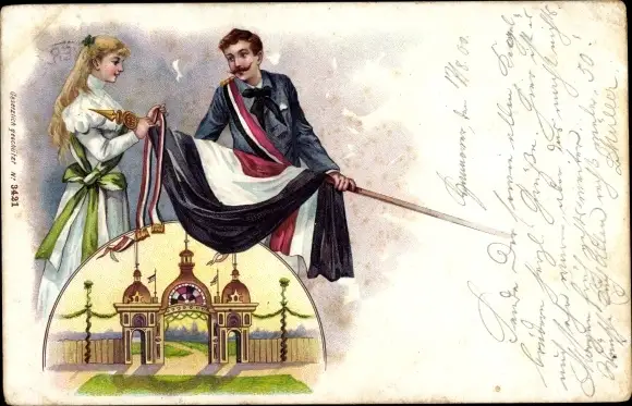 Litho Turner mit Fahne, Eingangstor, Turnfest