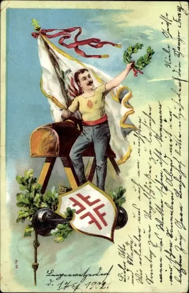 Litho Turner mit Siegeskranz, Pferd, Fahne